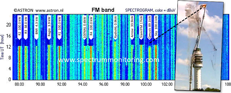 On 15 July 2011 two main broadcast towers in the Netherlands caught fire on the same day. The Lopik tower (367 meters) survived the fire, but the Smilde tower (294 meters) collapsed around 15:30h local time. Terrestrial Radio and TV broadcasts were interrupted in large parts of the country for about 1 year. A temporary mast (100 meters) was erected in nearby Assen city to repair some of the lost coverage. The sequence of events on the day of the Smilde collapse is clearly visible in the spectrogram below. This data is valuable input for further analysis. The Smilde tower has been rebuild. Despite strong clues, the root cause of the fires has not been determined conclusively to date.