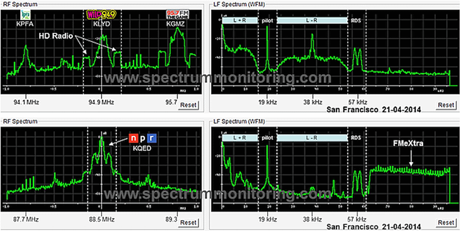 The neighbouring station at 95.7 MHz also has enabled HD Radio. The top right plot shows the analogue baseband (MPX) signal after demodulation which is not affected by the HD Radio technology. The 2nd proprietary IBOC solution is FMeXtra by Digital Radio Express and is shown in the bottom two plots. The signal was also captured in San Francisco (88.5 MHz / 110kW ERP / 387m HAAT). The FMeXtra technology places the OFDM carriers in the baseband (SCA), thus before FM modulation. Digital Radio Express claims that the modulation power will increase only little due to FMeXtra.