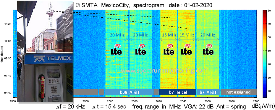 In Mexico City, we discovered an interesting case of 4G LTE carrier deployment in the 2.6 GHz band. Telcel (America Movil) holds a 30 MHz TDD licence in this band. While it is common to deploy 20 MHz + 10 MHz carriers in such a case, Telcel setup two 15 MHz carriers instead. The 15 MHz + 15 MHz configuration puts Telcel beyond AT&T, which has a 20 MHz TDD carrier on air. However, there may be valid reasons for this carrier deployment strategy such as traffic load balancing or fixed-mobile service differentation.